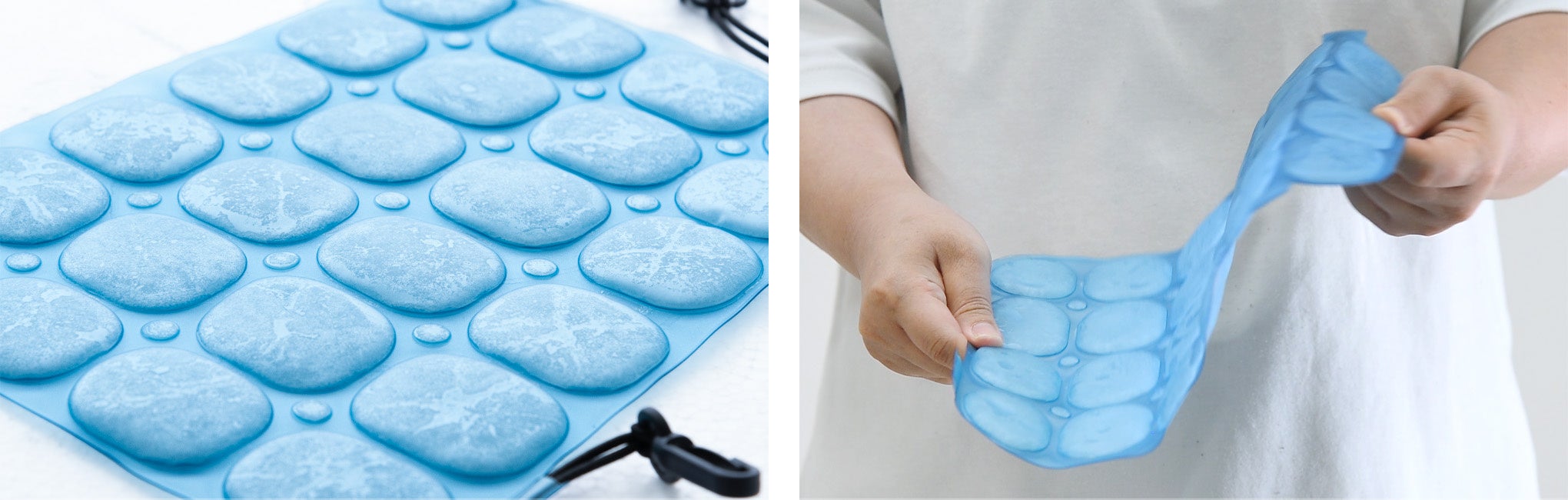本製品に使われている冷却素材“PCM”とは相変化材料(Phase Change Material)の略称で、宇宙飛行士を急激の温度変化から守るために開発された素材です。周辺温度が上がっても一定の温度以上は上がらない性質があり、28℃以下で自然に凍結するのが特徴です。
