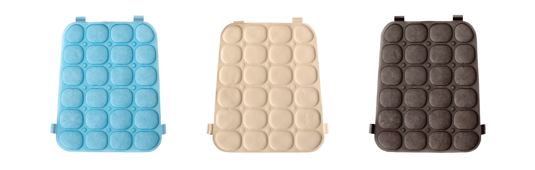 一般的な冷感パッドは6マス程とマス数が少なく曲がりにくくなっているため、背中に合わせて変形しづらくリュックやランドセルに合わせて使うと「浮いてきてひんやりを感じない」という欠点がありました。そこでタンスのゲンの「リュック用冷感パッド」は新たに開発した24マス独立構造になっており、マス数を24マスに増やし間隔を広げたことで背中にフィットしやすく快適にご使用いただくことができます。また、“PCM”は硬い素材で肌当たりが弱点でしたが独立構造でフィット性を向上させたことにより、ごつごつとした感触を軽減しました。