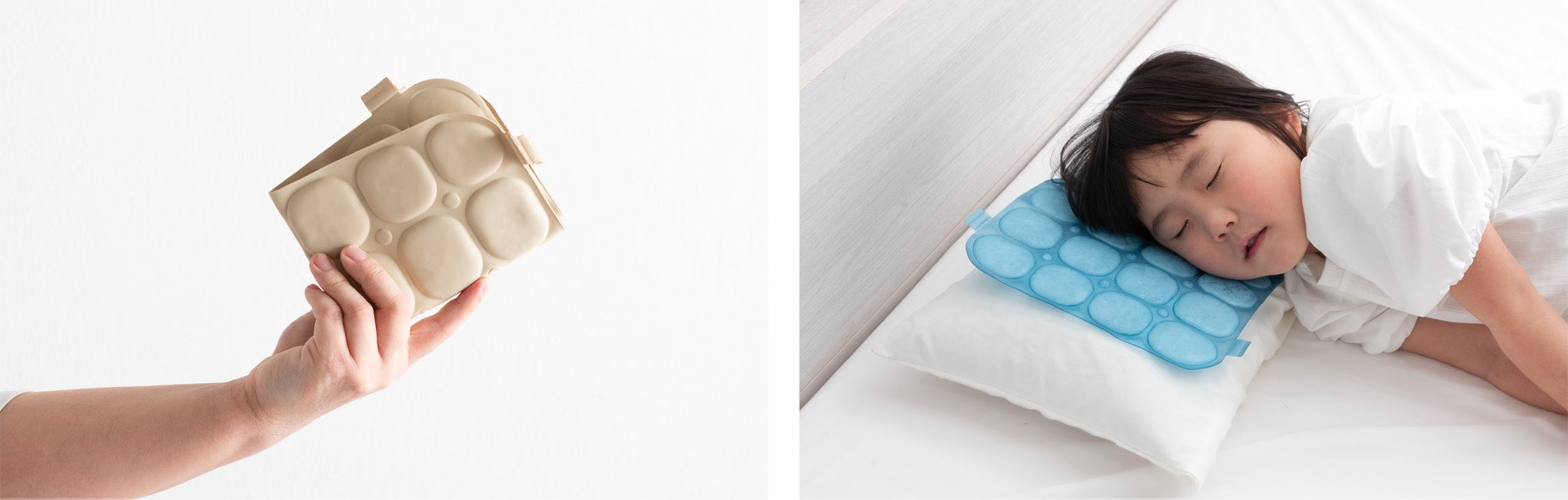 一般的な冷感パッドは長方形の形で、ランドセルやリュックに合わせるとはみ出てしまい見た目が気になってしまう心配がありましたが、本製品は上部が狭く下部が広い台形にすることで、リュックに合わせたデザインになっております。また、カラーバリエーションはひんやり涼しげな〈クリアブルー〉の他に、ランドセルやリュックの色に馴染みやすい〈ベージュ〉 〈クリアブラウン〉の3色展開となっています。