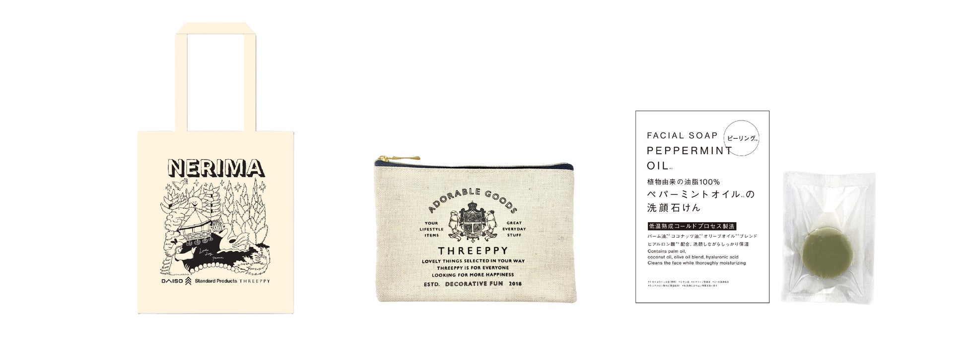 オープンを記念し3つのキャンペーンを行います。DAISO、Standard Products、THREEPPYで税込1,200円以上お買い上げのお客様へプレゼントいたします。(3店舗合算可能)