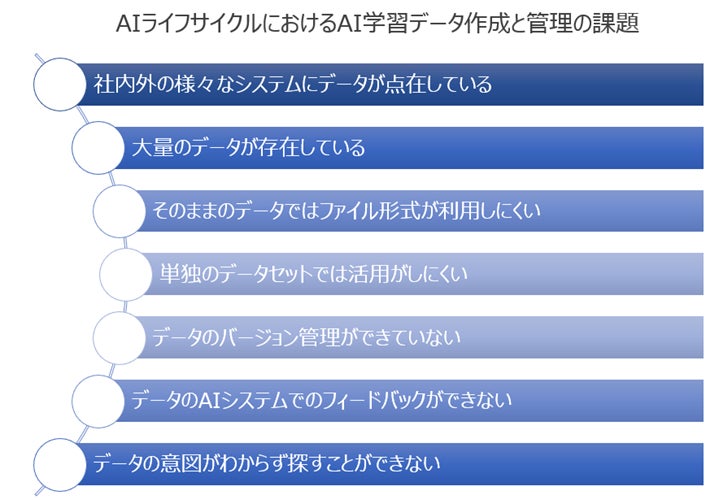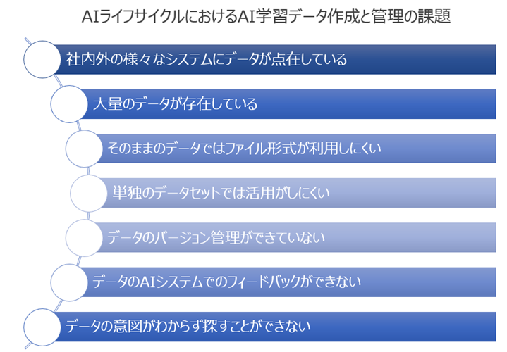 AIライフサイクルにおけるAI学習データ作成と管理の課題です。