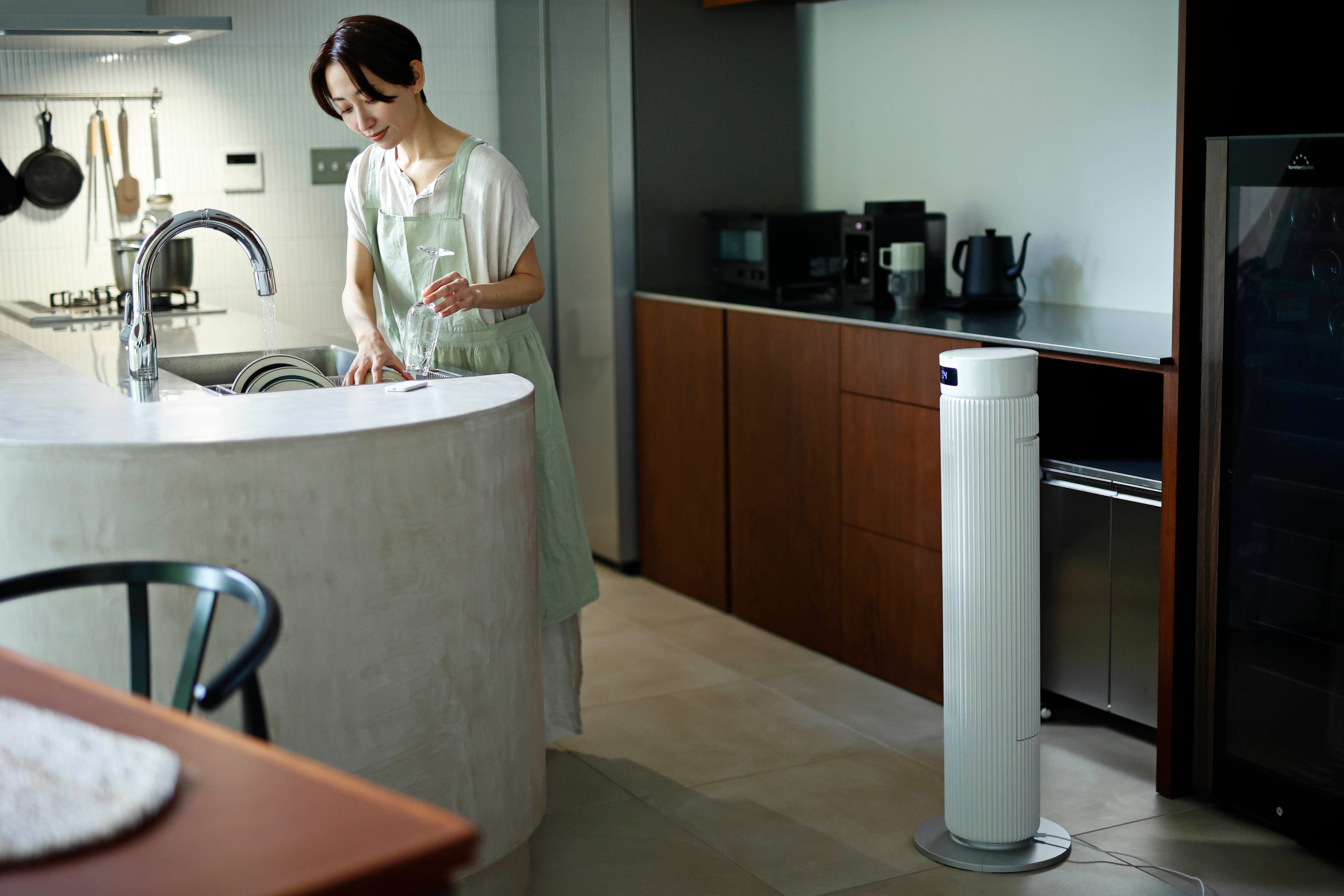 スリムな形状により省スペースで設置できるため、置き場を選びません。どのような空間にもなじみやすいシンプルかつスタイリッシュなデザインも特長で、全体に統一感が出るよう、柱形状の全面に縦ラインを施しています。さらに表示部と操作部は本体上部にまとめることで、操作のしやすさと外観のシンプルさを両立させました。