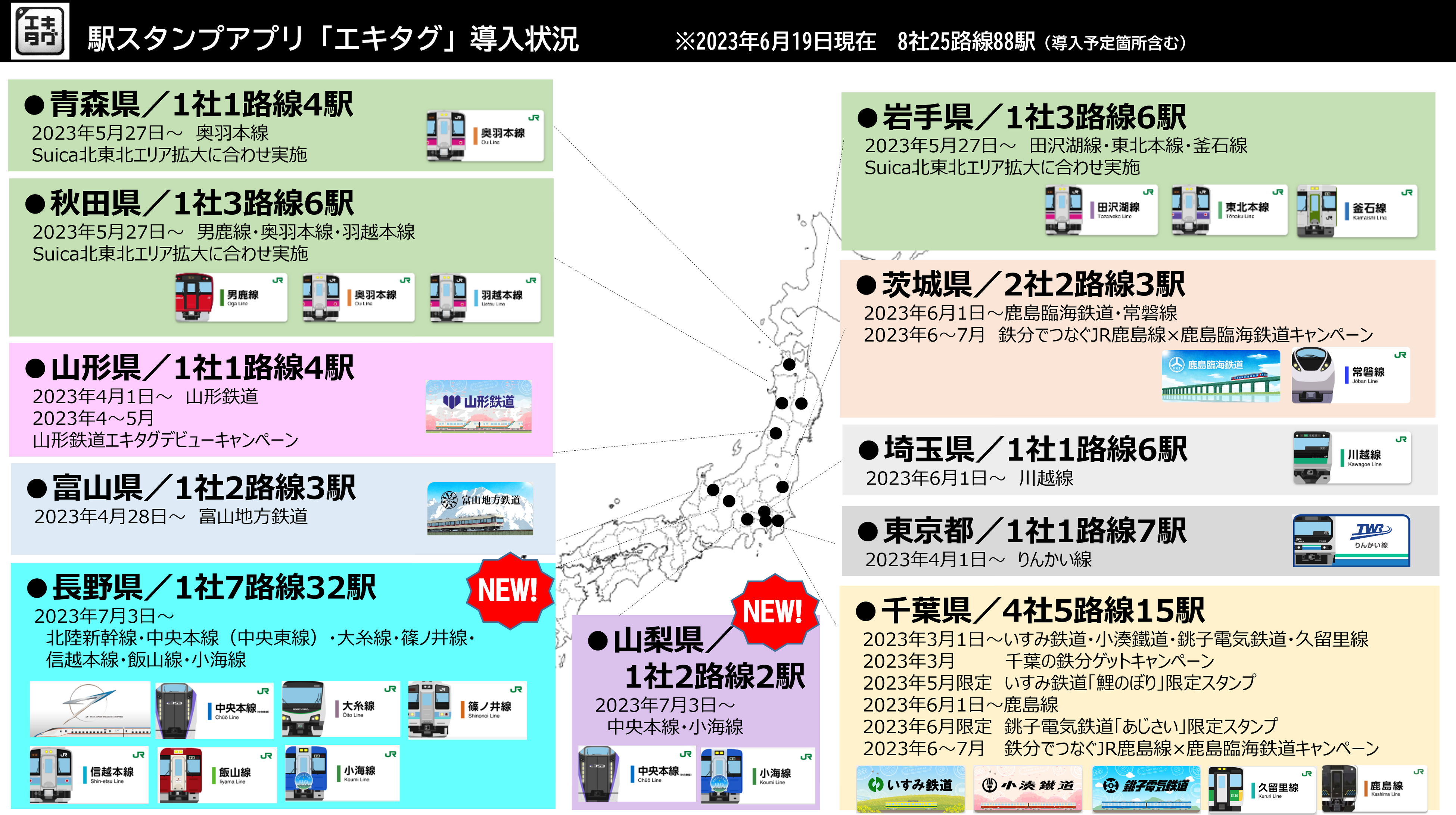 ※小淵沢駅と清里駅の所在地は山梨県です。山梨県でも、駅スタンプアプリ「エキタグ」初導入となります。