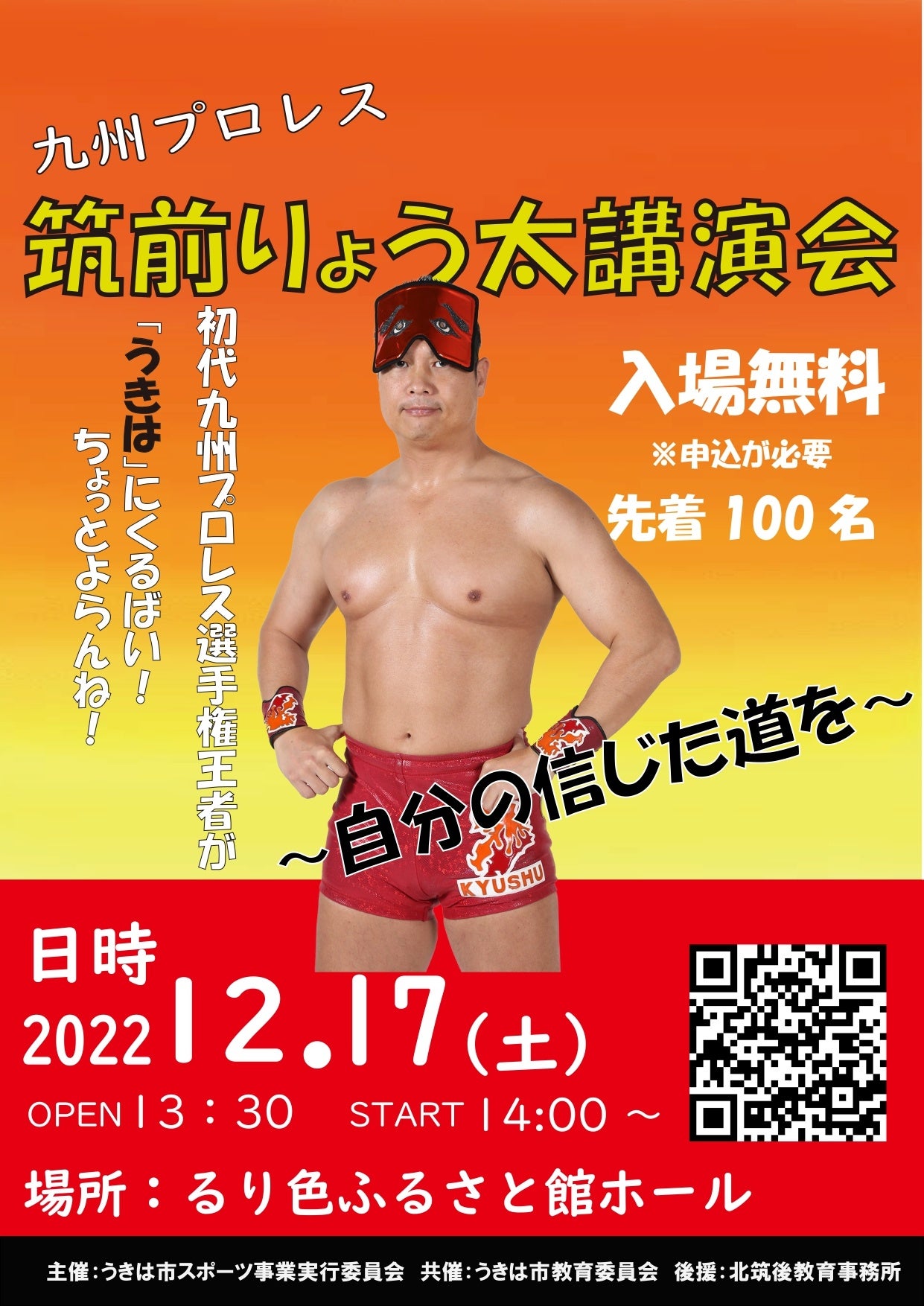 九州プロレス代表の筑前りょう太講演会をるり色ふるさと館で開催します。