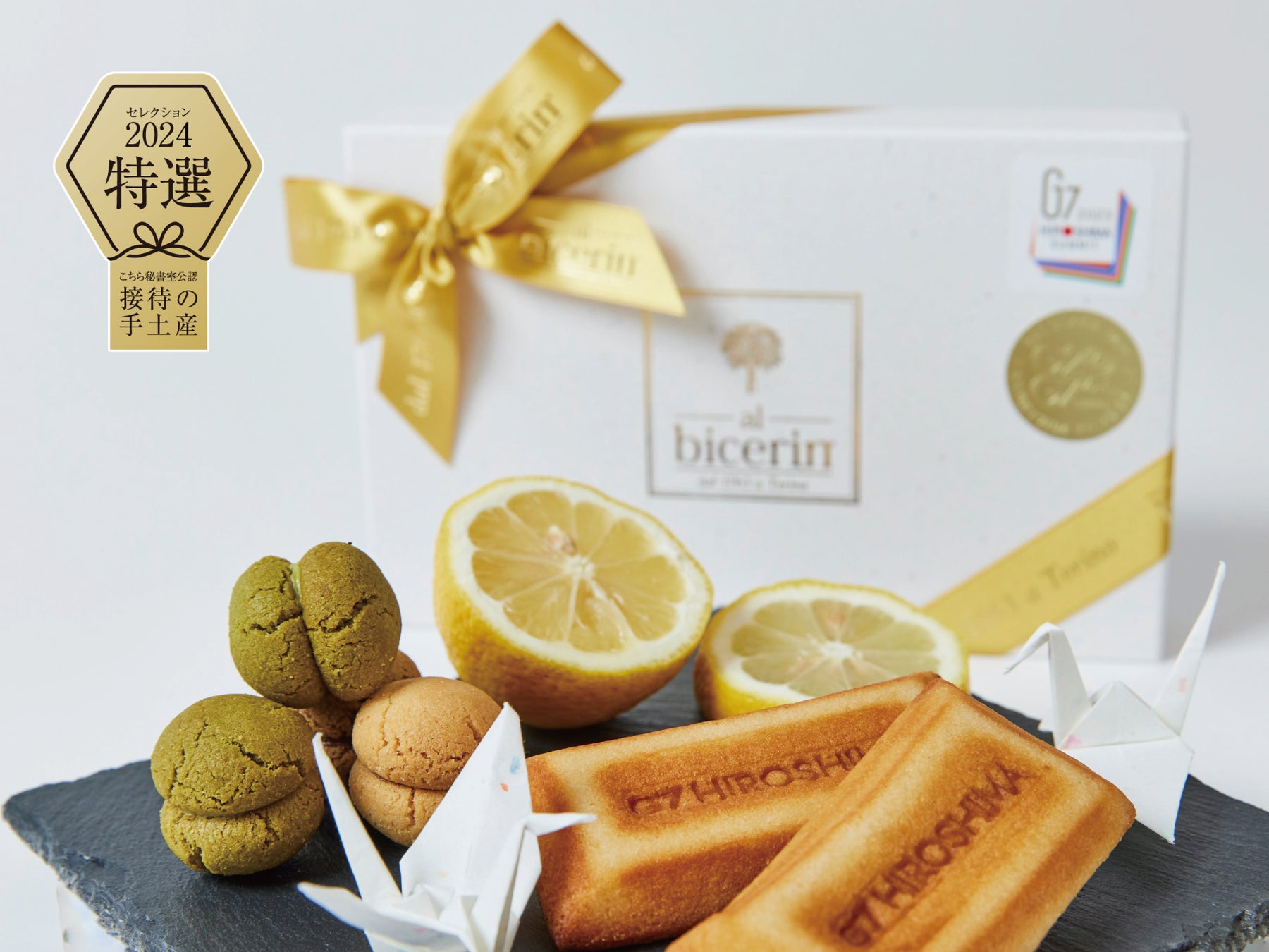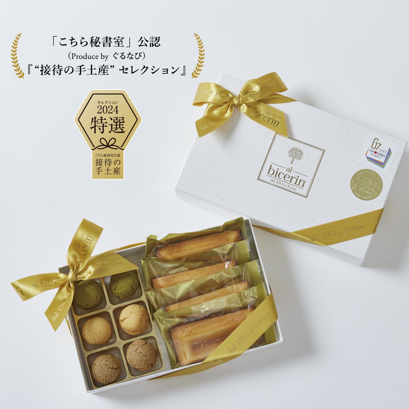 この度、特選に選ばれた商品は「G7広島サミット 2023」で各国首脳に提供された平和とサスティナブルへの思いより作られた、瀬戸田の無農薬レモンのフィナンシェと「G20大阪サミット 2019」「G7伊勢志摩サミット 2016」日本政府公式提供商品のバーチ・ディ・ダーマの詰め合わせです。プレーンのフレーバーの他、伊勢神宮神宮司庁御用達芳翠園抹茶、ビチェリンの沖縄珈琲エスプレッソの3色の味わいをお楽しみ頂けます。