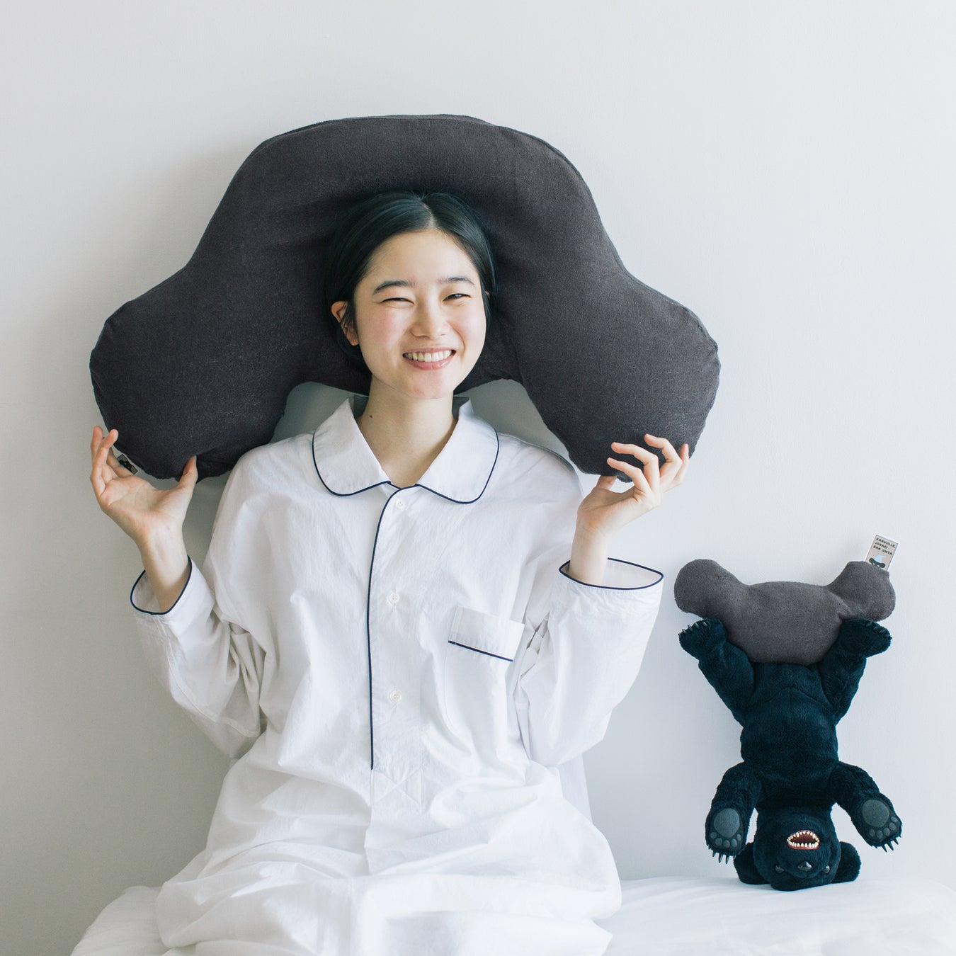 快眠セラピストの三橋美穂さんといっしょにつくった、「ねむれないくまのために」オリジナルのまくらです。一見ファンシーアイテムのようですが、意外にも、まくらの基本をしっかりおさえた実力派。上下を「さかだち」させたくまの顔が、あお向けで寝るとき、横向きで寝るとき、どちらでもリラックスした自然な姿勢をとれるよう、立体的な形状でサポートします。ご家庭で扱いやすいよう、洗濯機でまるごと洗えるようにしました。高品質なタオルに使われる、肌ざわりがいいパイル地のカバーがついています。