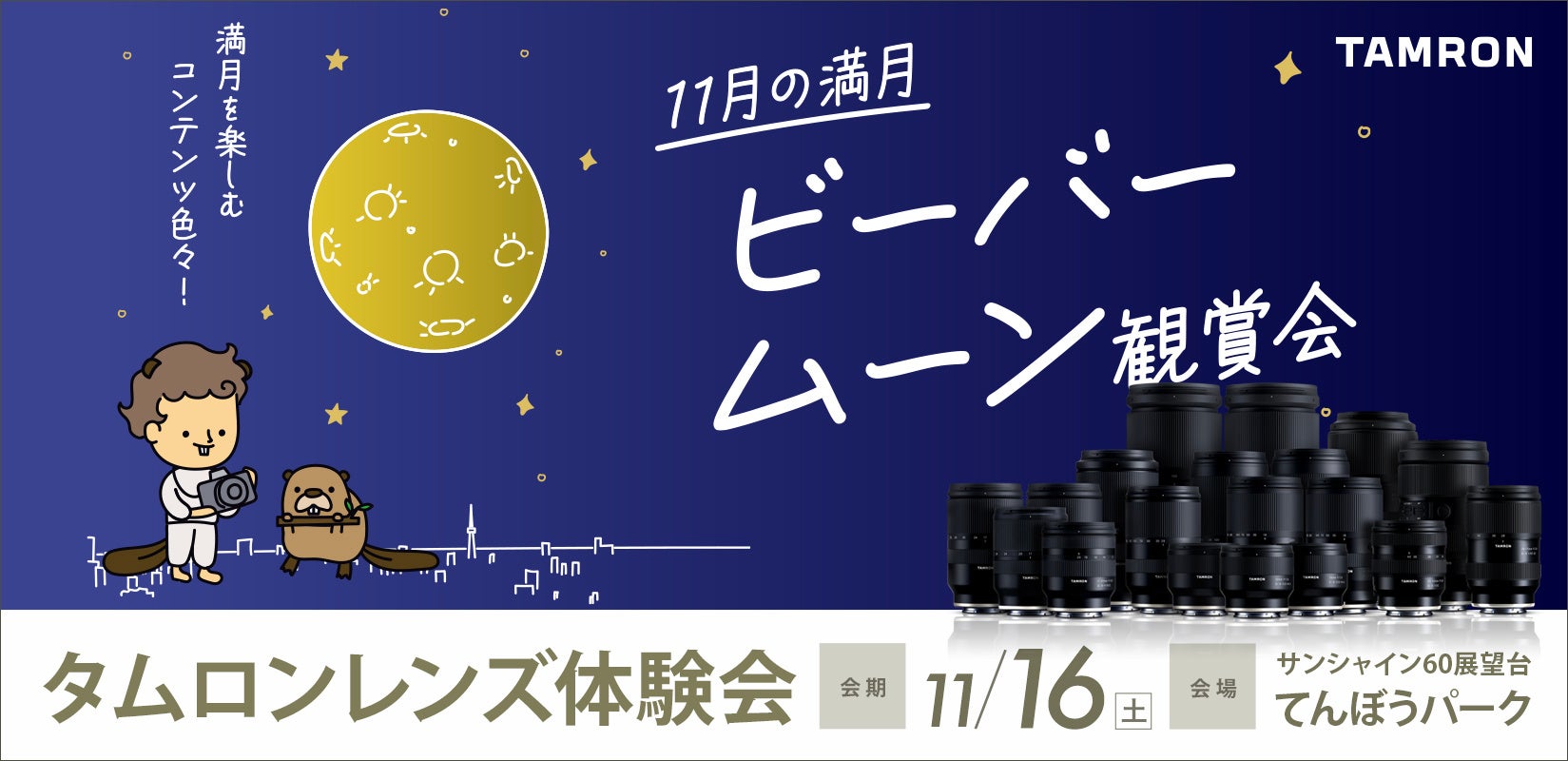 株式会社タムロンは、2024年11月16日(土)、池袋のサンシャイン60展望台 てんぼうパークで開催される11月の満月 ビーバームーン観賞会に参加いたします。