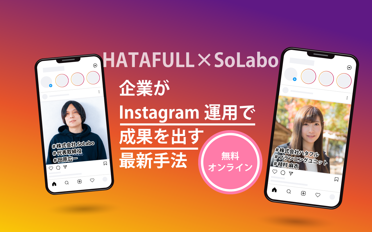 本セミナーでは、自社で4つのLINE公式アカウントを運用しノウハウを活かしたLINE集客支援を手掛けるSoLaboと、30社以上のインスタアカウント運用データを元に独自のInstagram活用方法を確立したハタフルが、Instagramの運用をテーマとしたセミナーを開催いたします。