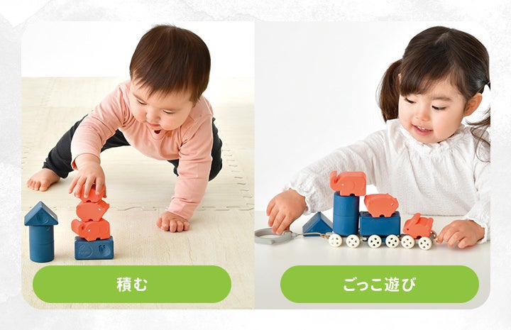 「どうぶつパーツ」に「でんしゃ」に「つみき」と、赤ちゃんが大好きな定番おもちゃの入ったセットです。
