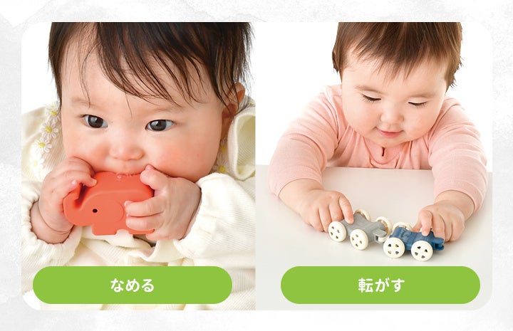 生まれたその日から、にぎにぎしたり、なめかみしたり。赤ちゃんの成長とともにいろいろな遊び方ができるから、大きくなってもずっと一緒に遊べます。
