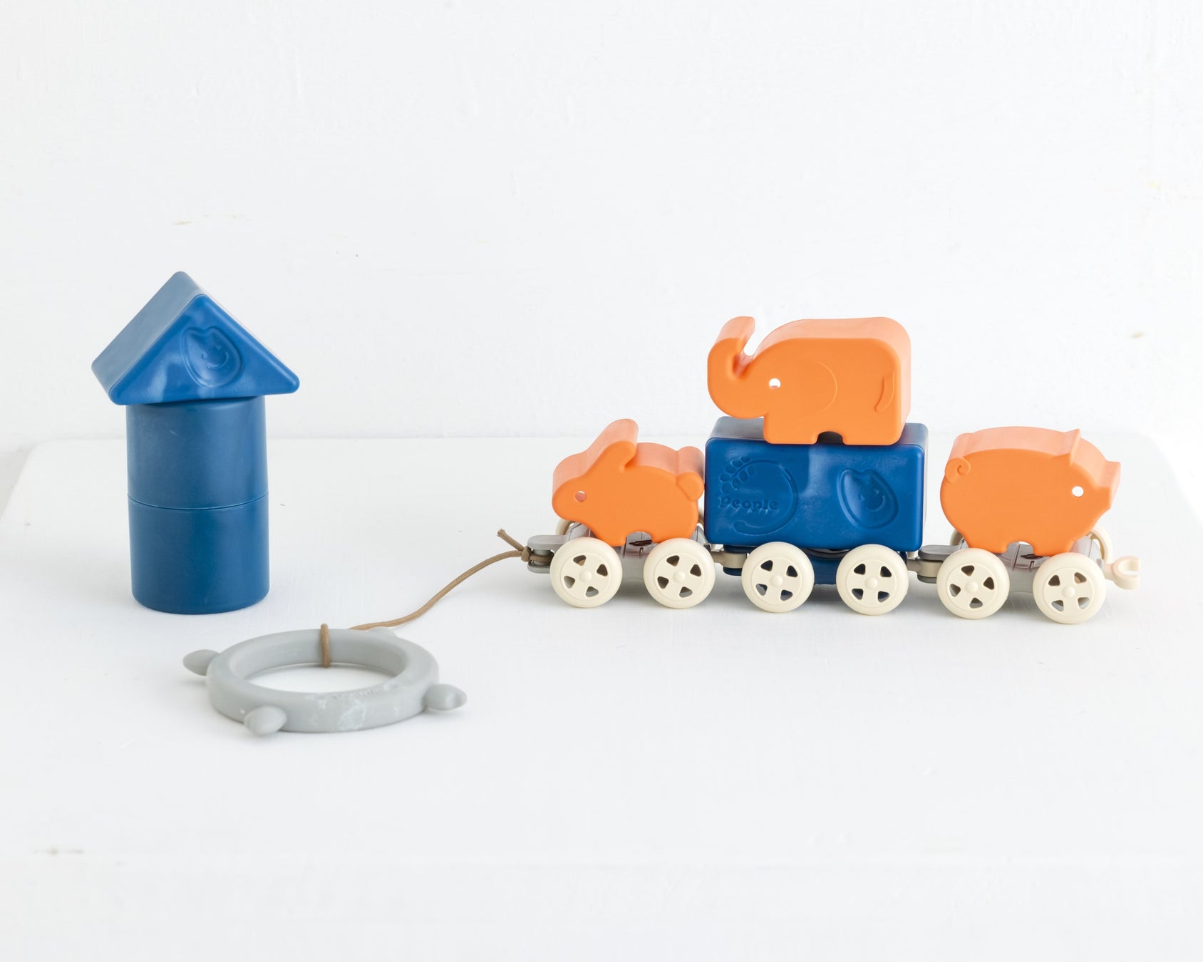 セット内容:でんしゃ3台(うち、リング付き1台)、どうぶつパーツ3ピース(ぞう1/うさぎ1/ぶた1)、 つみき3ピース(三角柱1/円柱1/直方体1)