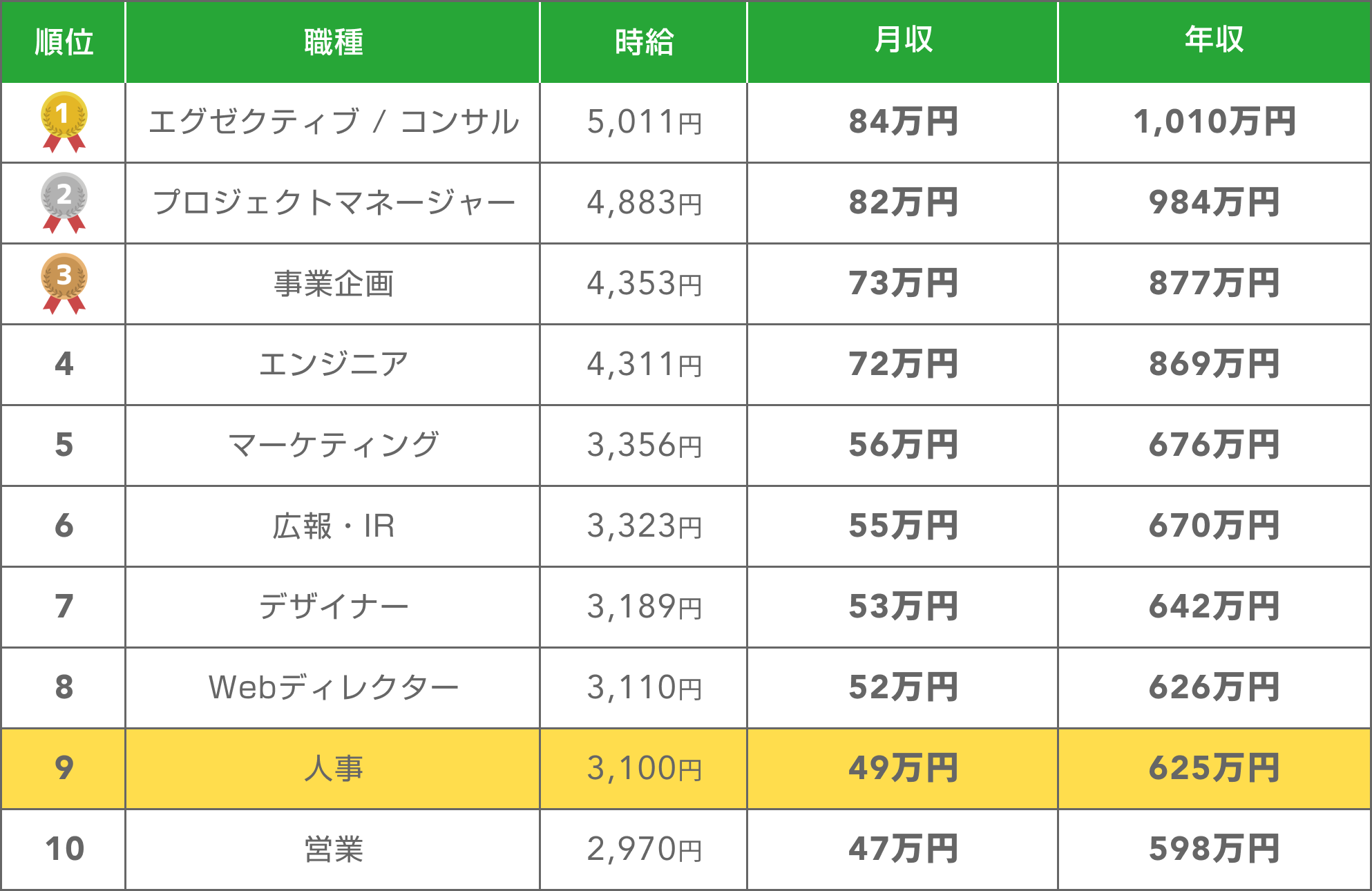 平均年収625万円(職種別年収ランキングトップ10中、9位)