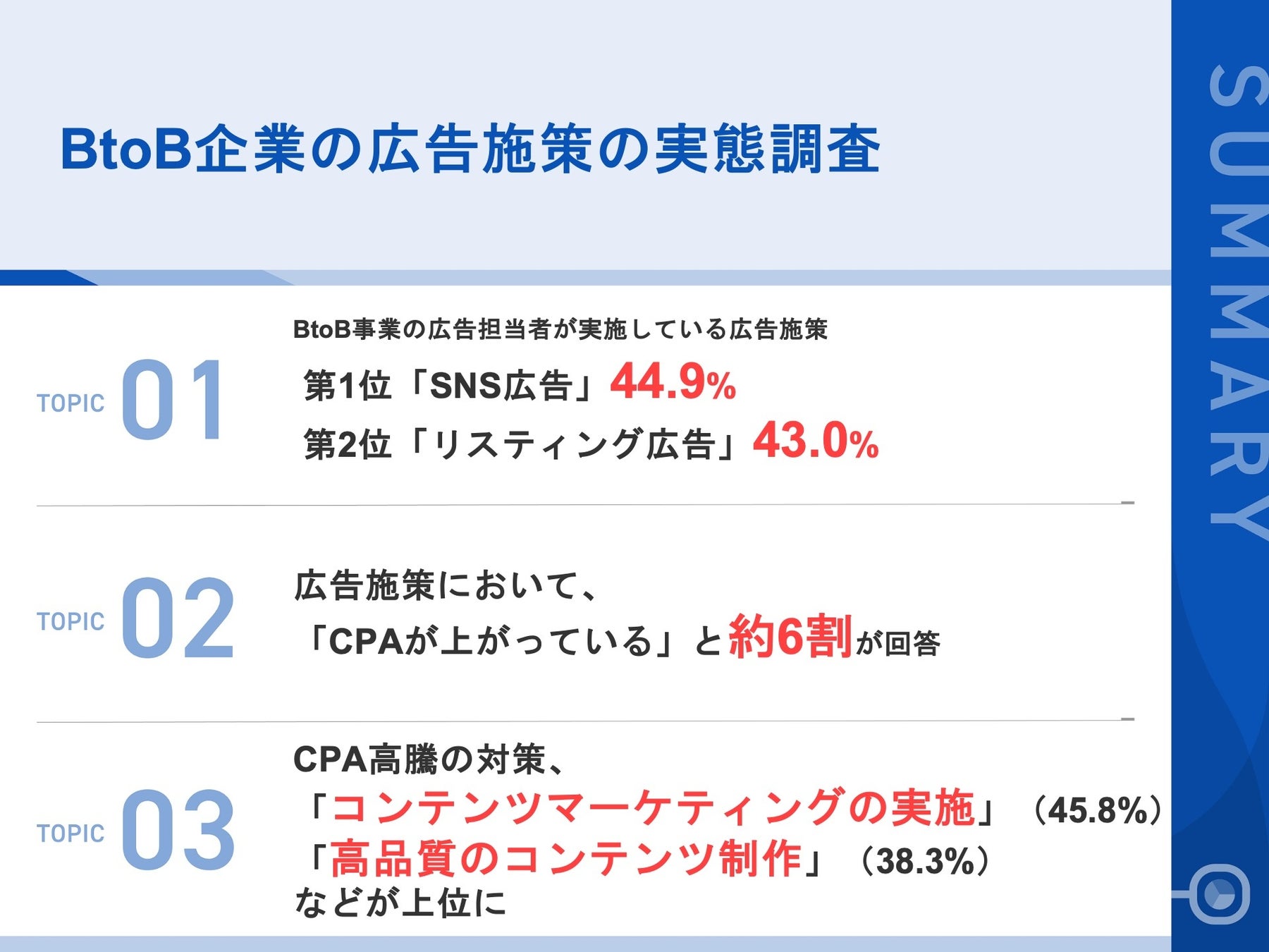 今回は、BtoB事業の広告担当者107名を対象に、BtoB企業の広告施策の実態調査を実施しました。