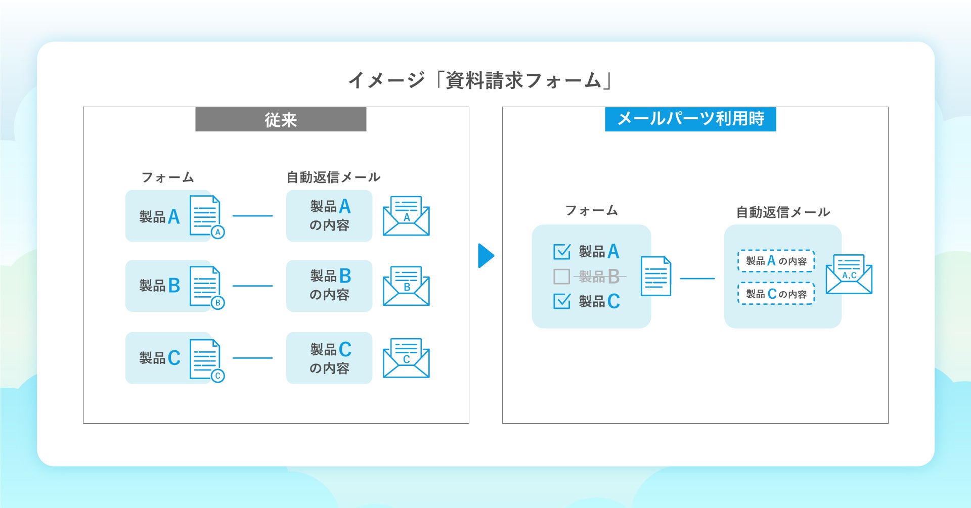 条件に応じたメールパーツ出し分け:フォームの登録内容によって、必要なコンテンツを差し込んだ返信メールの自動送信