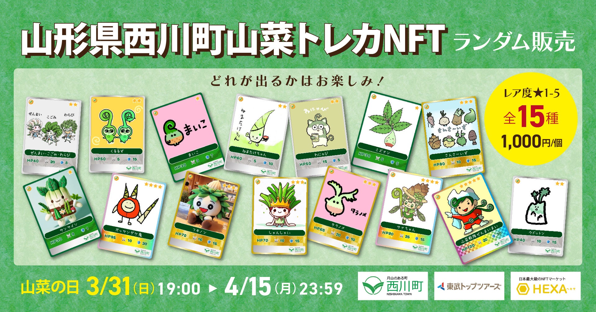 山形県西川町、3月31日「山菜の日」に西川町デジタルトレカNFT第二弾となる山菜トレカNFTをランダム販売!NFTマーケットのHEXA(ヘキサ)