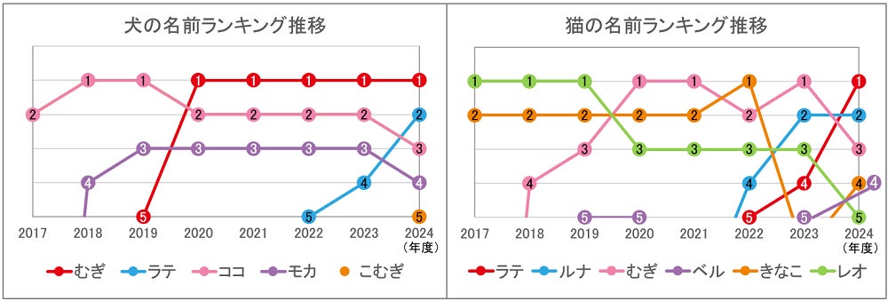 過去8年間の上位5位の推移を振り返ると、犬の名前では2020年度に「むぎ」が1位に躍り出ており、それまで1位だった「ココ」が2位となりました。「ラテ」も年々順位を上げています。猫の名前では、2022年度から特に変動が大きく、犬と同様に猫の名前でも「ラテ」が年々順位を上げています。
