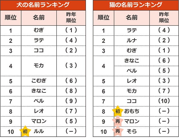 総合ランキングでは、犬の名前は、「むぎ」が5連覇を達成しました。10位の「ルル」は調査開始以来、初めてのランクインです。昨年は犬と猫、どちらも1位が「むぎ」でしたが、猫では「ラテ」が初めて1位を獲得しました。また、猫の名前では、8位の「おもち」が初のランクインとなりました。