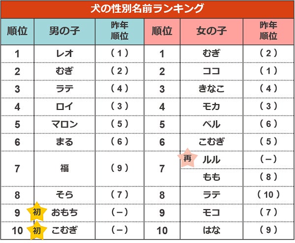 (犬)男の子は「レオ」が10年連続1位、女の子は「むぎ」が初めて1位