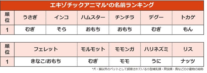 エキゾチックアニマルのランキングでは、初めてトカゲ、フェレット、モルモット、モモンガ、ハリネズミ、リスを対象とし、種別を増やして1位の名前を調査しました。「むぎ」「おもち」「きなこ」「そら」など犬と猫の総合ランキングにランクインする人気の名前もあれば、モモンガの「モモ」や、ハリネズミの「うに」、リスの「ナッツ」など種別を連想するような名前もあり、違いが見られました。