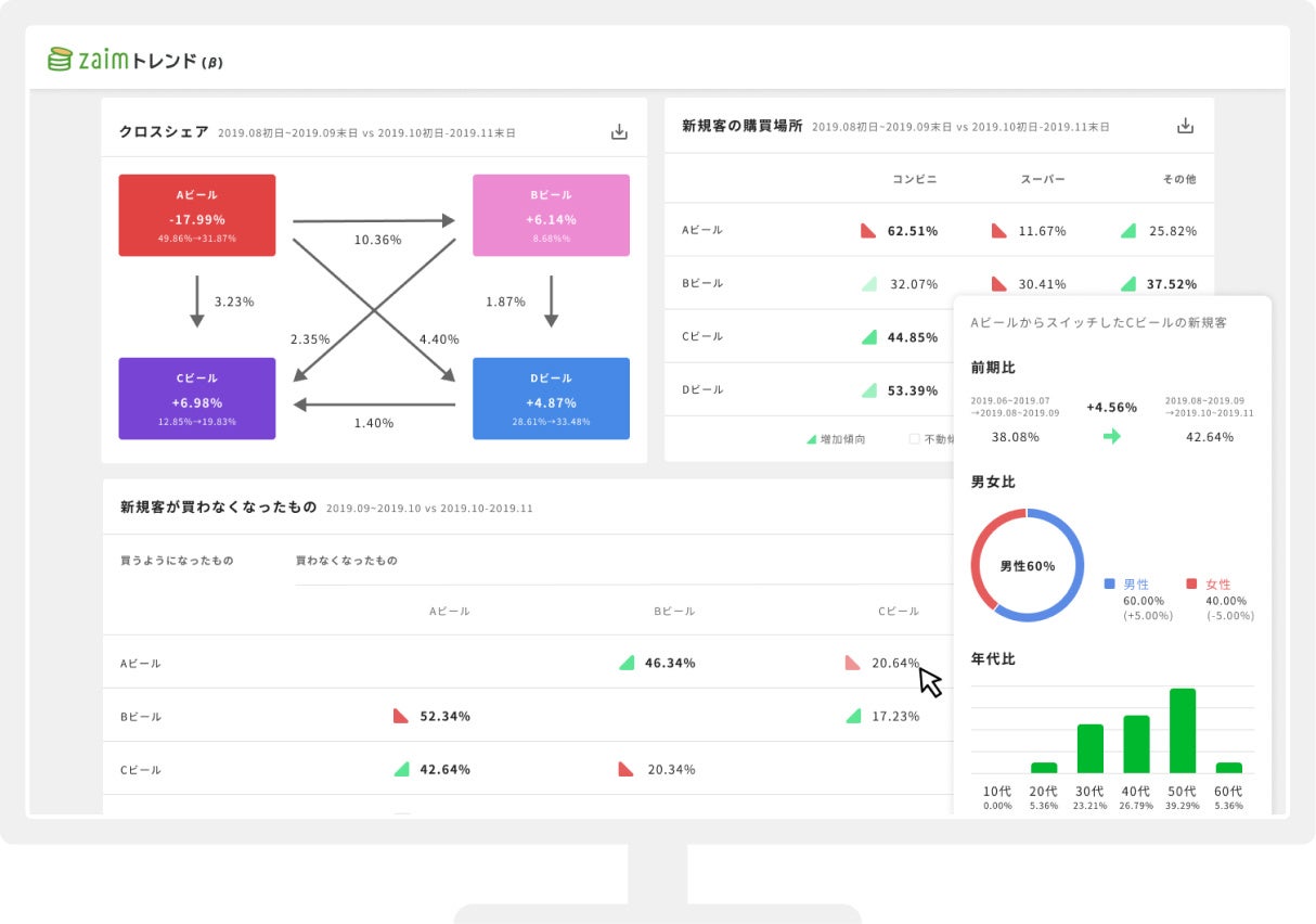 家計簿サービスである「Zaim」の家計データを匿名化し、統計解析することで「どこからどこへ購買の変化があったのか」を明らかにするマーケティングツール。個別商品のほか商品カテゴリ同士の分析や店舗ごとの分析にも対応している。