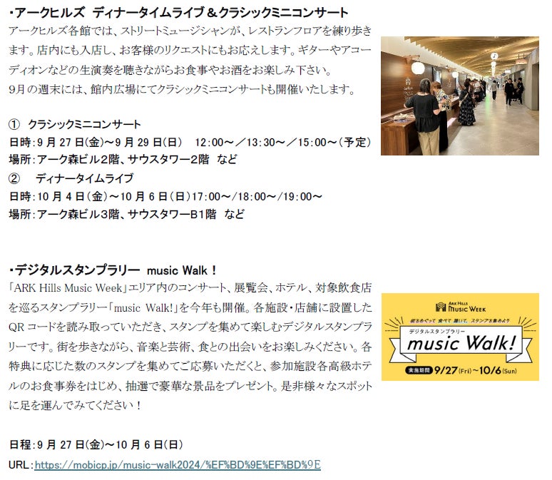 森ビル株式会社(東京都港区、代表取締役社長 辻󠄀 慎吾)が運営するアークヒルズ(東京都港区)では、9月27日(金)~10月6日(日)の10日間、隣接するサントリーホールと共同で「ARK Hills Music Week 2024」を開催します。