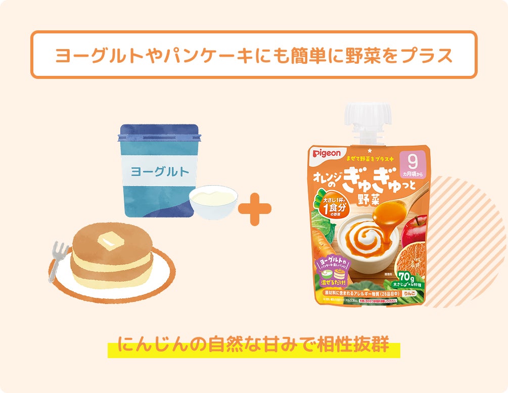 レトルトフード・ヨーグルト・パンケーキ・蒸しパン・おかゆなど、お子さんの普段の食事やおやつに混ぜるだけで手軽に野菜が摂取できます(※1)。さらっとなめらかな液体で混ぜやすく、様々な食材や料理との相性が良いため、上記以外にも幅広い組み合わせが楽しめます。