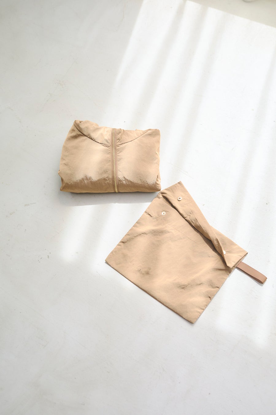 シャイニーナイロンの素材は、その名の通りキラキラしていてツヤがあります。だからカジュアルなのにちゃんときれい。ジップやボタンのゴールドで、大人キレイめコーデとしての印象もUP。裾はドロスト仕様となっているため、リラックス~コンパクトまで気分でシルエットを楽しめます。