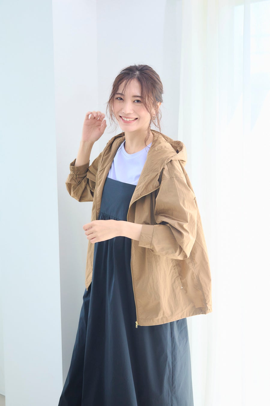子どもの行事は参加型より「見守り派」というママには、スカートスタイルでも楽しめるキャメルのウィンドブレーカーがオススメ。ジップやボタンもゴールドでまとまっているため、スポーティさが軽減し女性らしく着こなせます。
