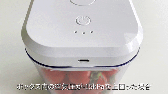 蓋には空気圧感知センサーを内蔵しています。ボックス内の空気圧が-15kPaを上回ったと感知された場合、ポンプは自動的に空気を吸い出しますので、ボックス内をいつでも真空状態に保つことができ、空気漏れの心配もありません!