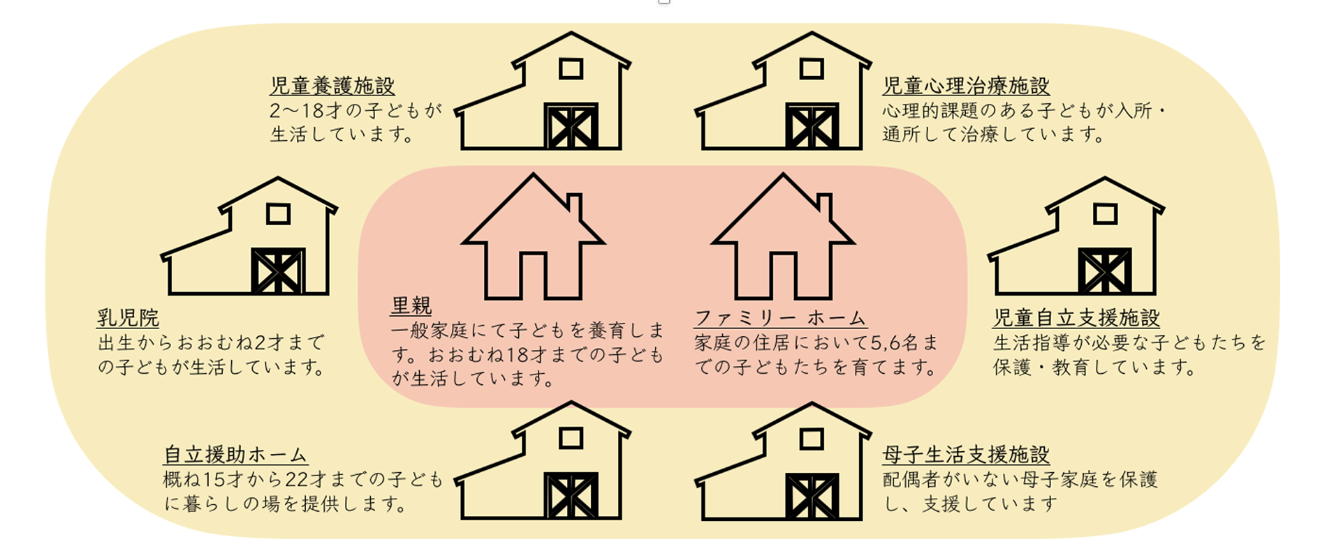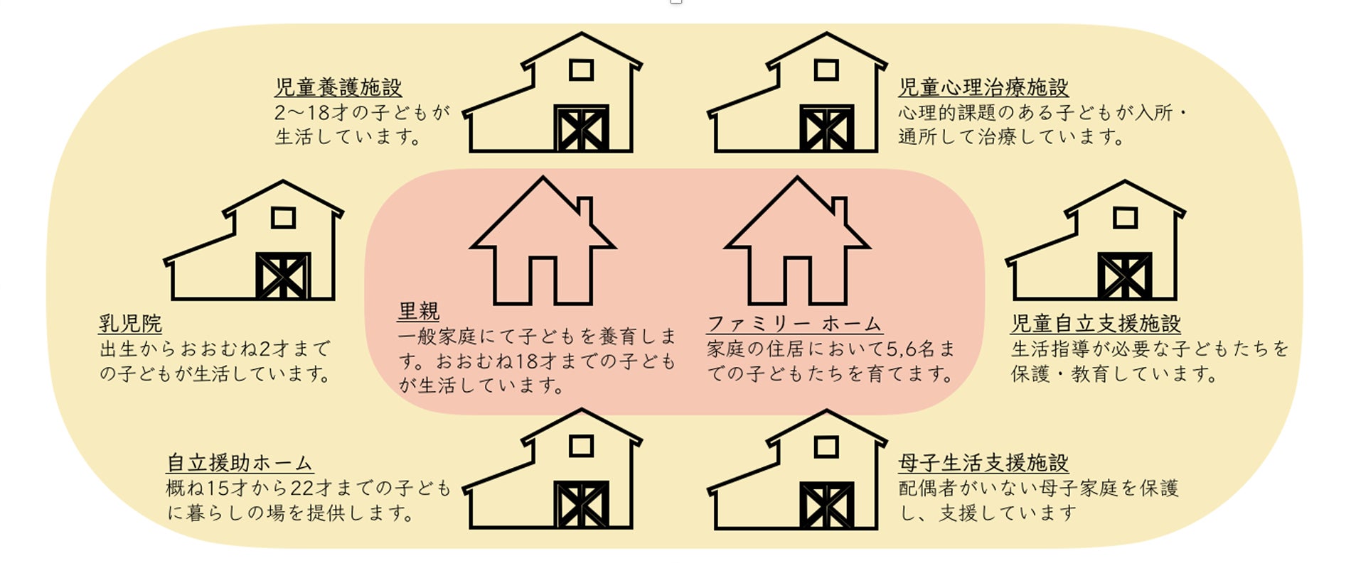 *1 虐待や経済的理由などで保護者のもとで暮らせなくなった子ども達を、社会全体で育て支援する仕組み。またその子どもの家族も支援します。社会的養護は、「子どもの最善の利益のために」と「社会全体で子どもを育む」を理念として行われている。
