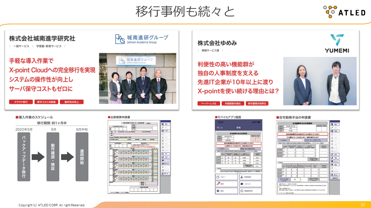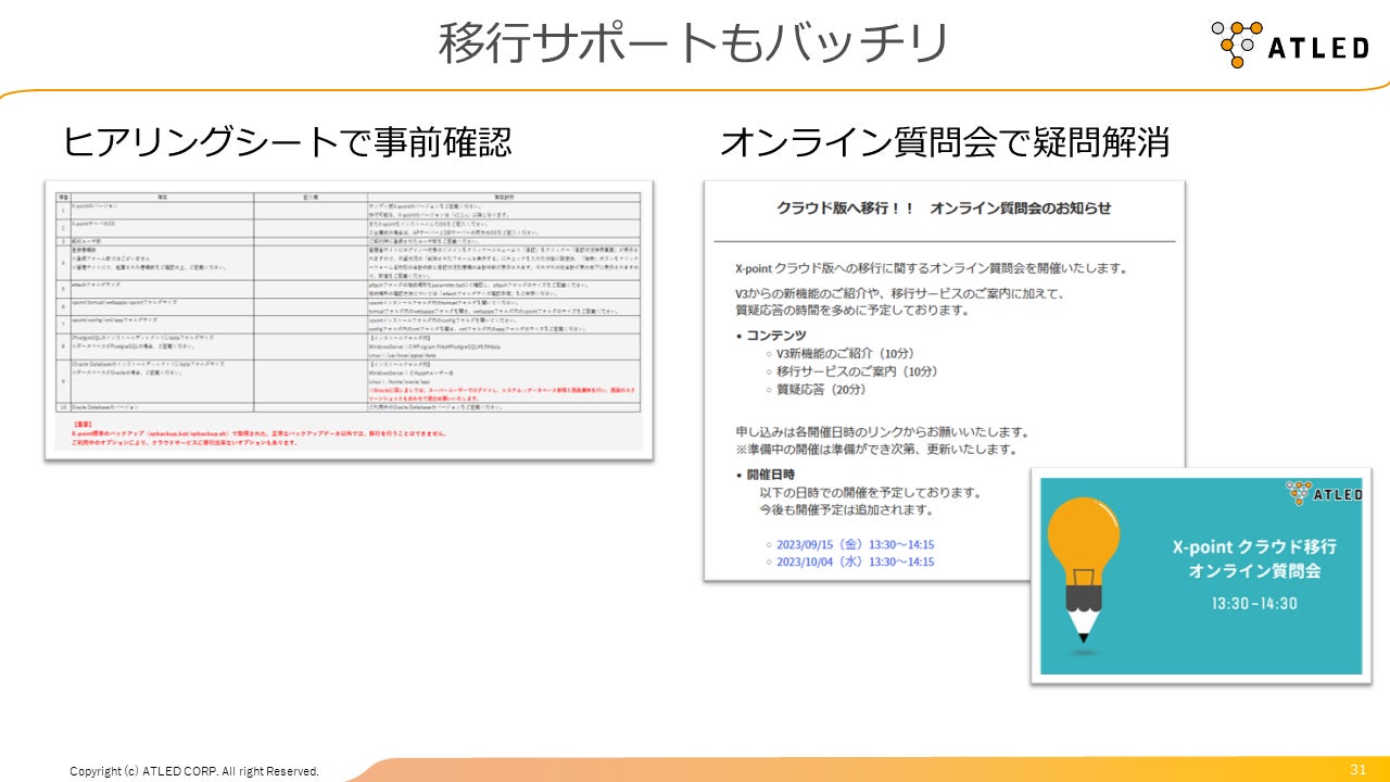 現在、オンプレミス版の「X-point」をご利用いただいているユーザー様にスムーズにクラウド版へご移行いただけるよう、サポートサイト上で移行ガイドなどの情報提供や「クラウド移行オンライン質問会」など様々なご支援を展開しています。