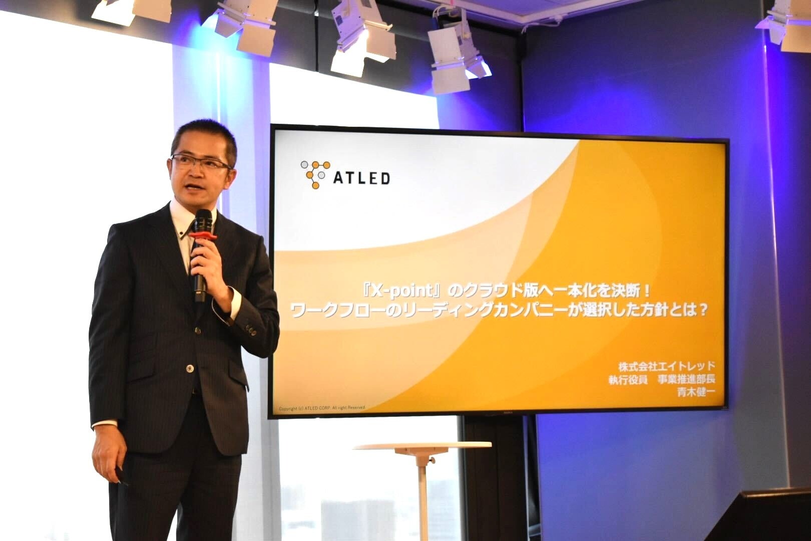 エイトレッドからは執行役員 事業推進部長の青木が『「X-point」のクラウド版へ一本化を決断!ワークフローのリーディングカンパニーが選択した方針とは?』と題して登壇いたしました。