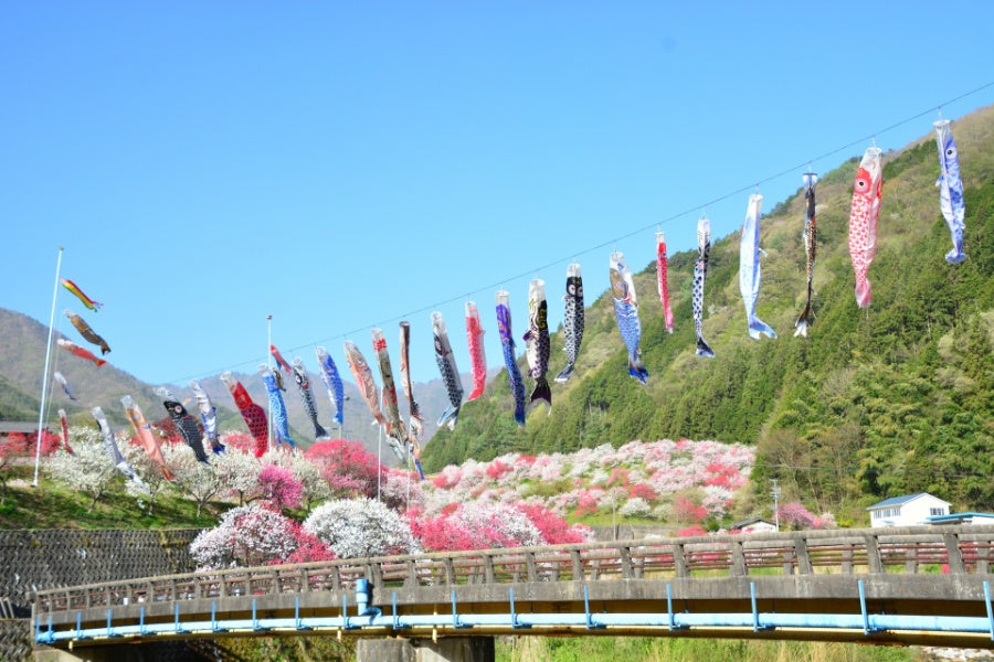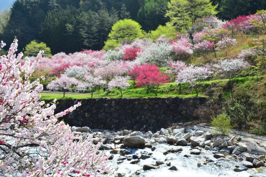 また阿智村は、知る人ぞ知る「花桃」の名所。桜のあとに色鮮やかに咲き誇る約10,000本の花桃が里を彩ります。その中でも、中央自動車道・園原ICからすぐ、mokki周辺の「月川温泉郷/花桃の里」では、約5,000本の花桃が密集して咲き誇り、圧巻の美しさとなります。