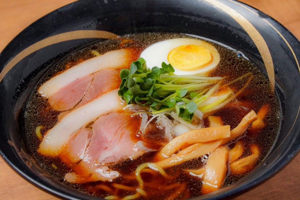 信州ジビエの鹿骨を丁寧に下処理して、コトコト5時間煮込んだスープとさっぱり仕上げた鶏ガラスープを合わせたWスープ。えぐみが取れ、口当たりの良い旨味はこだわりの生麺と相性抜群。鹿肉のモモ肉の中でも希少部位となる芯玉を使用した自家製チャーシューは、野生味あふれるジビエ肉本来の味を楽しめます。