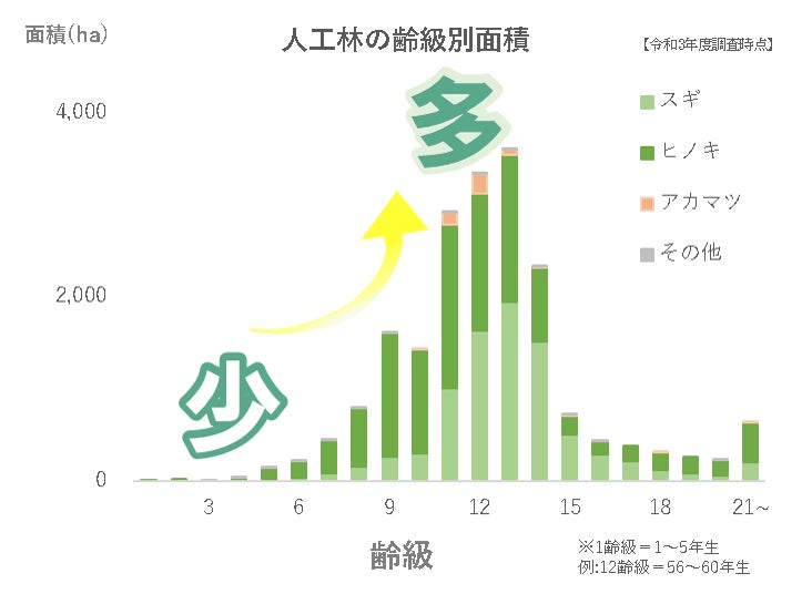 福知山市は総面積55,254haのうち、実に約75%を森林が占めています。スギ・ヒノキなど人の手で植えられた人工林(スギ・ヒノキ)の樹齢は、61~65年生が最も多く、51~70年生に集中しています。これは、全国でよく見られる傾向で、戦後拡大造林(50~70年前)に植えられたスギ・ヒノキが成熟して伐採できる状態になっている一方で、直近30年では木材価格の低迷と植林費用の負担等から、植林がほとんど行われておらず、若い森林が極端に少ない状態になっています。