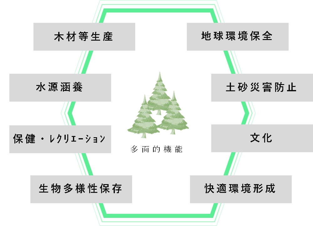 森林は、私たちに木材を供給してくれるだけでなく、二酸化炭素を吸収する、水を貯留し洪水を緩和する、土砂の流出を防ぐ、川や海へ養分を供給する、多様な生物を育む、風景や安らぎを与えるなど、さまざまな機能を有しており、これらを総称し『森林の有する多面的機能』と呼ばれています。