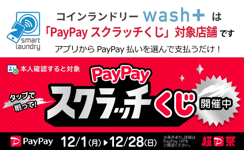 株式会社wash-plus(本社:千葉県浦安市、代表取締役:高梨健太郎)が運営する「コインランドリーwash+(ウォッシュプラス)」は、2025年12月1日(月)~12月28日(日)に実施される「PayPayスクラッチくじ」の対象店舗です。