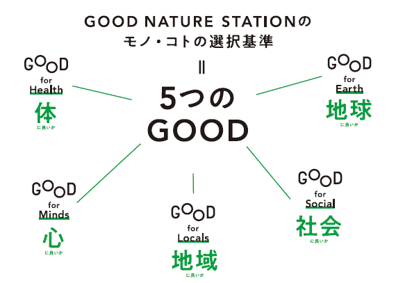 「5GOOD」の体・心・地域・社会・地球に良いことで人々を繋ぎ、多くの人が集い、サステナブルな未来に繋がる、GOOD NATURE STATIONはそのような場所を目指します。