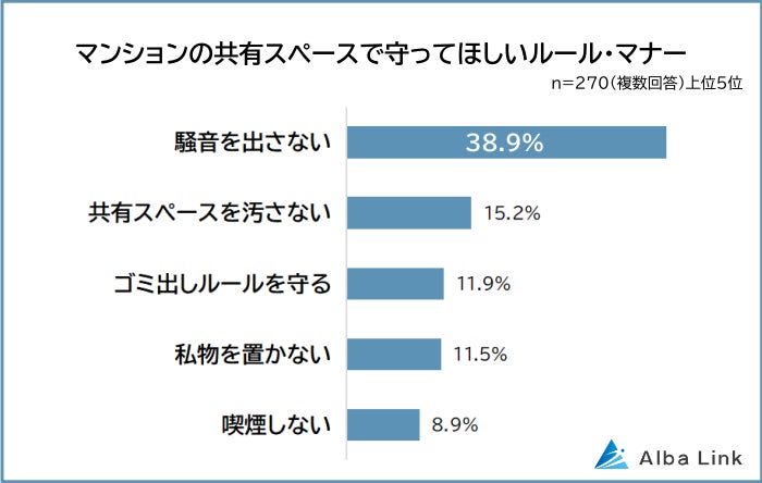 株式会社AlbaLink(本社:東京都江東区、代表取締役:河田 憲二)は、マンションにお住まいの270人を対象に「マンションの共有スペースでのトラブルに関する意識調査」を実施し、そのデータをランキングにしました。