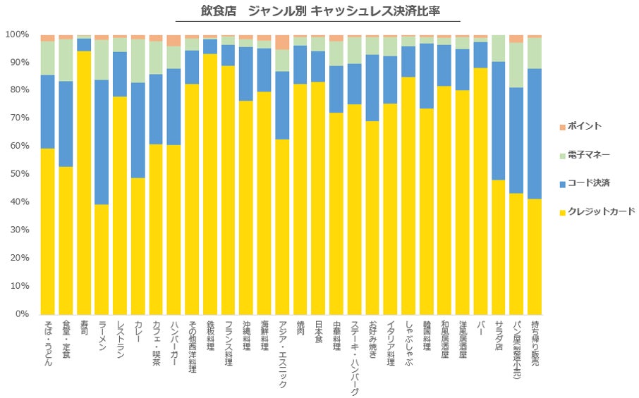 ● ジャンル別に見ると、28ジャンル中17ジャンルでキャッシュレス比率が50%を超える。また、コード決済比率が高いサラダ店では、その比率が20%を超える。