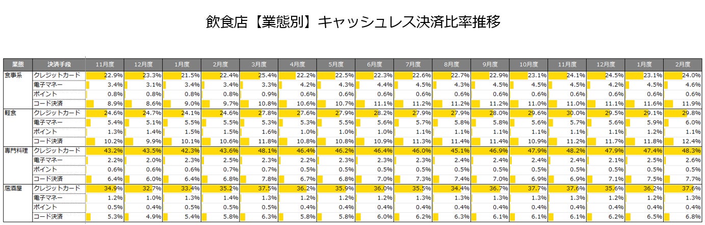 キャッシュレス決済比率は1月度から2月度にかけて、すべての業態で増加した
