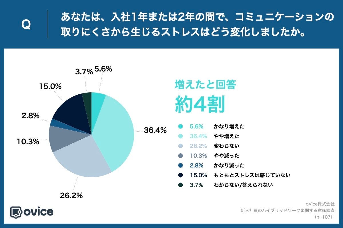 「Q.あなたは、入社1年または2年の間で、コミュニケーションの取りにくさから生じるストレスはどう変化しましたか。」(n=107)と質問したところ、「かなり増えた」が5.6%、「やや増えた」が36.4%という回答となりました。