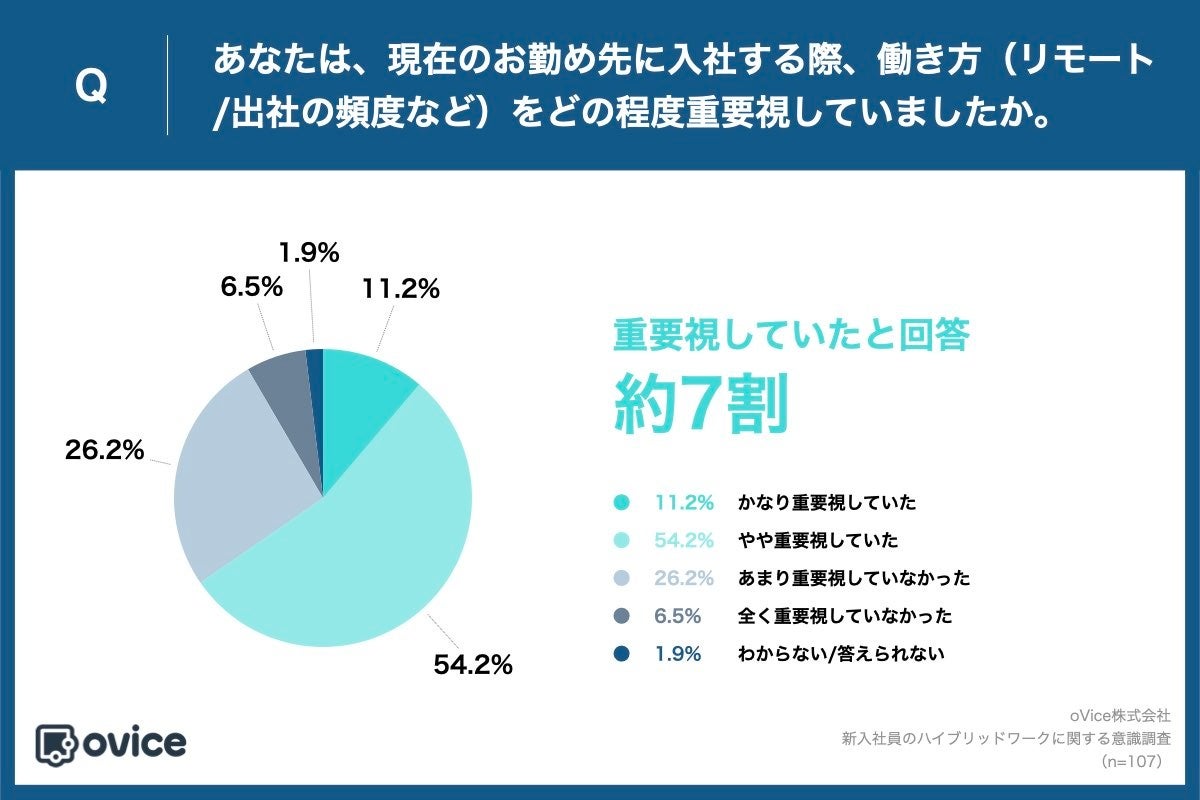 「Q.あなたは、現在のお勤め先に入社する際、働き方(リモート/出社の頻度など)をどの程度重要視していましたか。」(n=107)と質問したところ、「かなり重要視していた」が11.2%、「やや重要視していた」が54.2%という回答となりました。