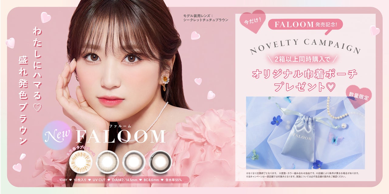 PIA株式会社(本社:東京都品川区 代表取締役:見原 博道)は、本日2024年9月26日(木)にHKT48、IZ*ONE出身で俳優として活躍中の矢吹奈子がプロデューサー&イメージモデルを務めるカラーコンタクトブランド『FALOOM(ファルーム)』を発売いたします。また発売を記念し、『FALOOM(ファルーム)』2箱以上同時購入でオリジナル巾着ポーチがもらえるノベルティキャンペーンを実施いたします。