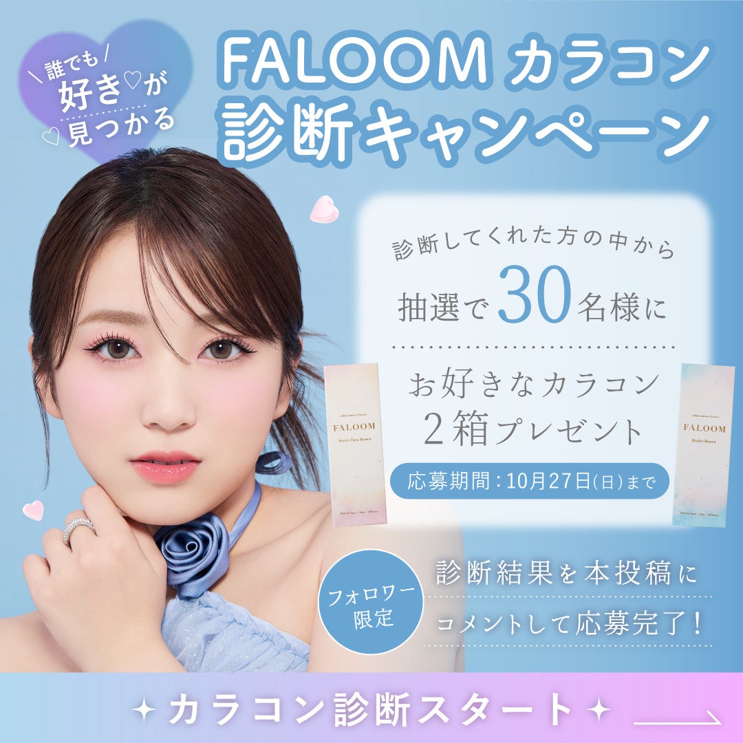 公式Instagramをフォロー&診断結果をコメントにて報告していただいた方の中から、抽選で30名様にFALOOMのお好きなカラコン2箱をプレゼントいたします。ぜひカラコン診断をお試しください 。