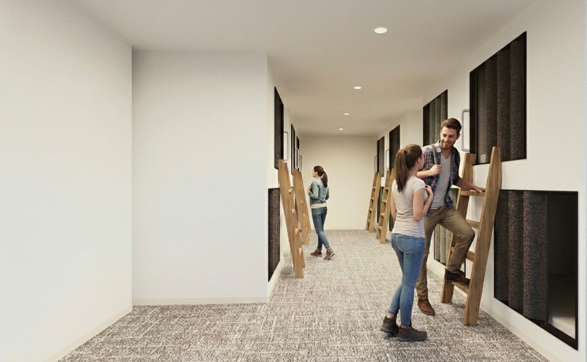 ドミトリールームは男女共用に加え、女性が安心して利用できる「女性専用ドミトリールーム」も配置。エレベーターによるフロアセキュリティに加え、各客室の入り口にはカードキー式のセキュリティドアを採用しています。複数名でリーズナブルに宿泊できる「グループ個室」、専用のシャワールーム・洗面台・トイレを備えた「ホテル個室」など、旅の目的やスタイルに合わせて柔軟に選べるラインナップです。