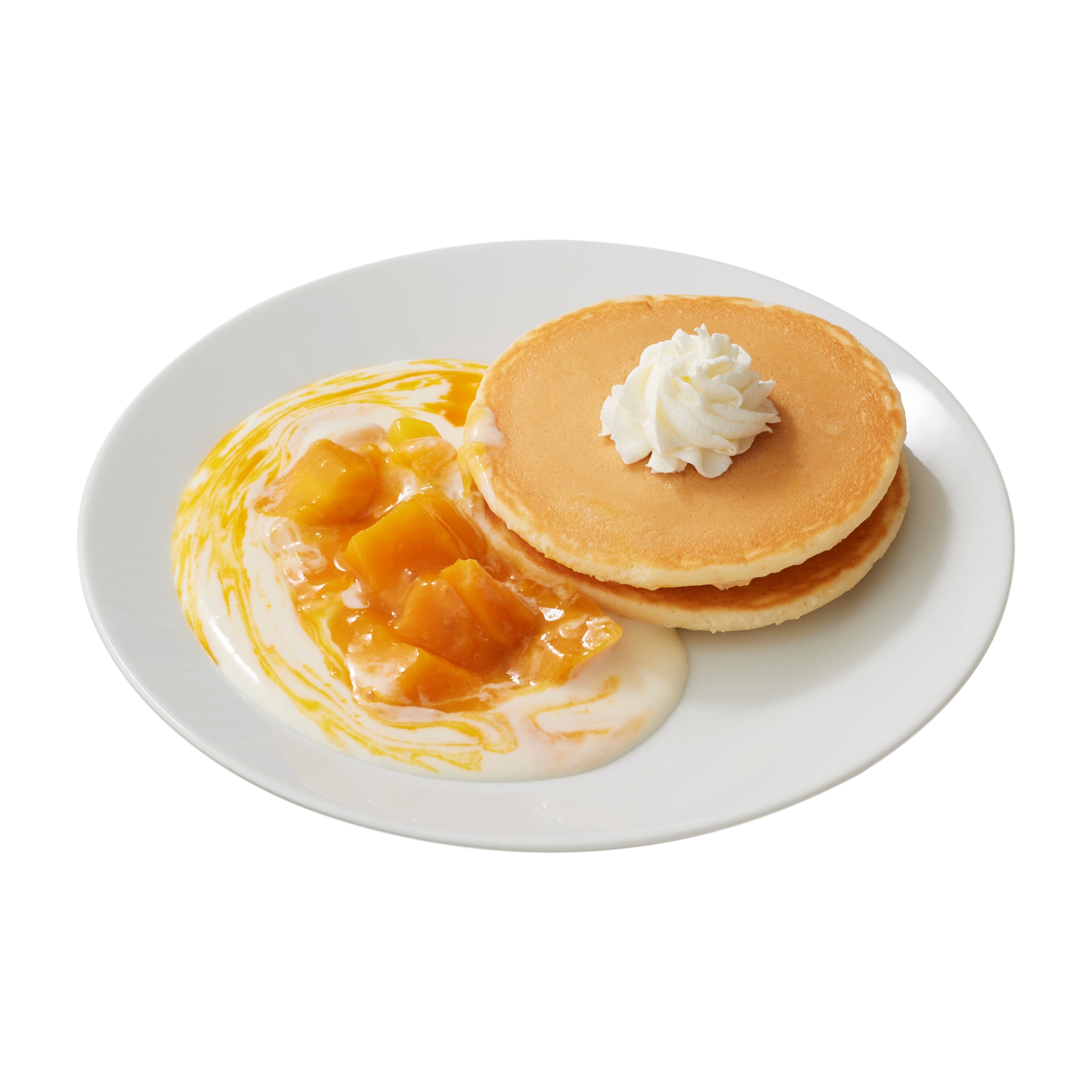爽やかなヨーグルトソースと果肉入りのマンゴーソースをたっぷりとかけた、夏らしさを感じるパンケーキ。ソースはお好きな量をかけてお楽しみいただけます。
