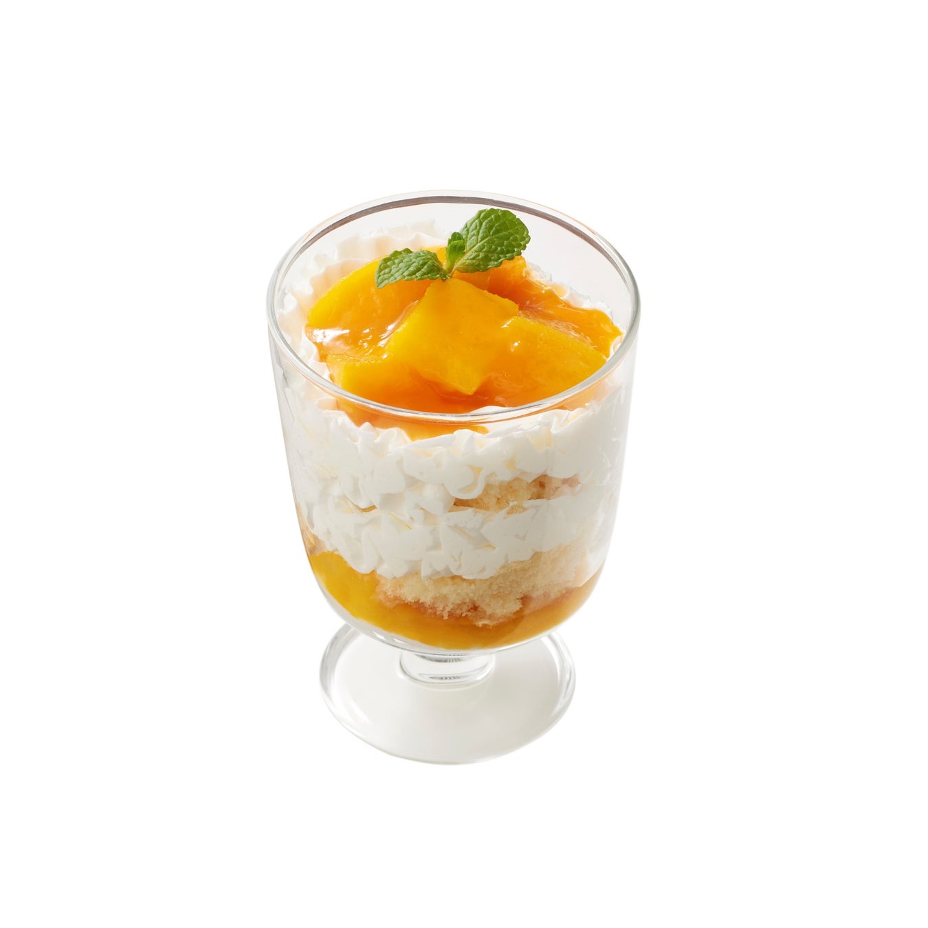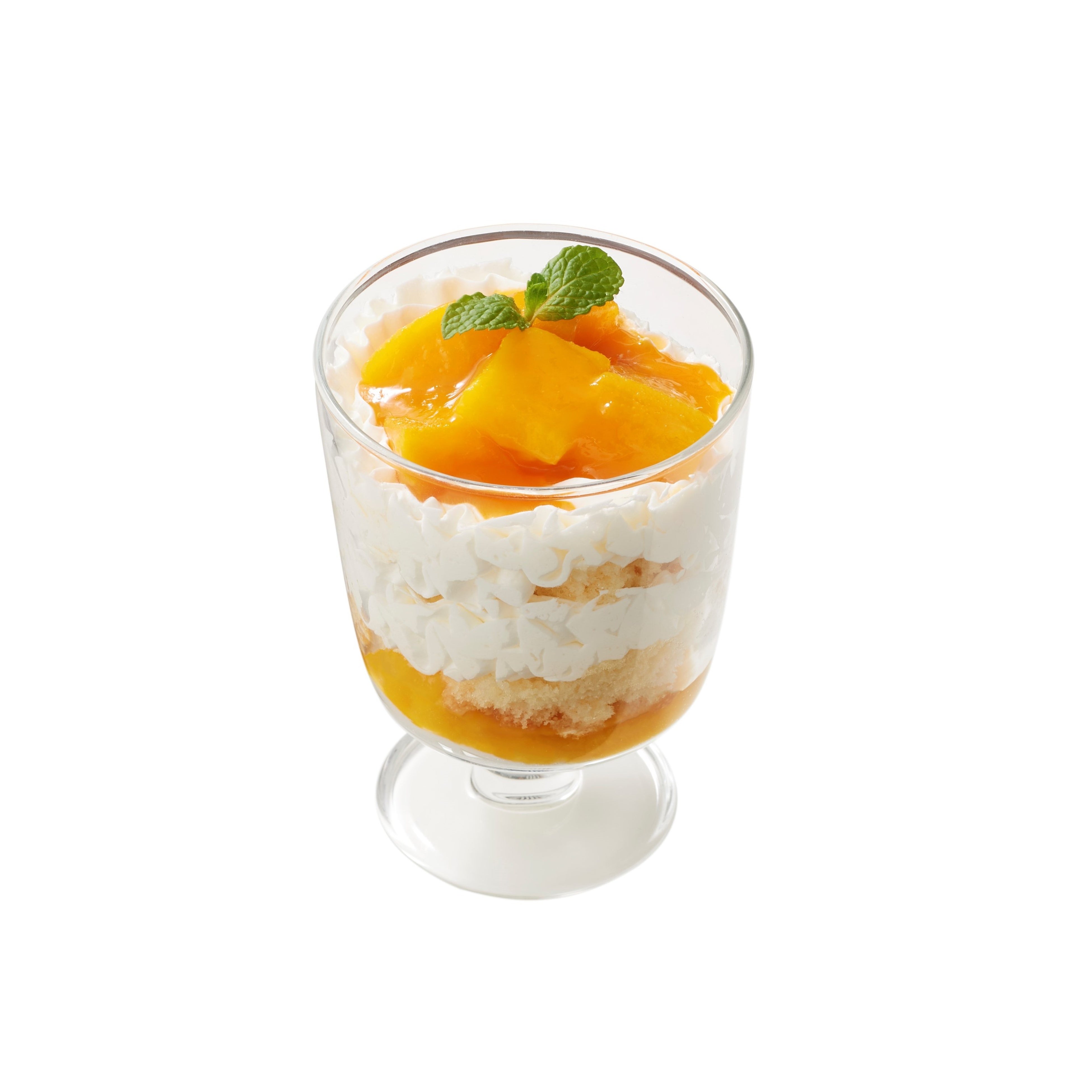 スポンジケーキをたっぷりのホイップクリームで挟み、最後にマンゴーの果肉とソースをかけた、暑い夏にぴったりなパフェ。