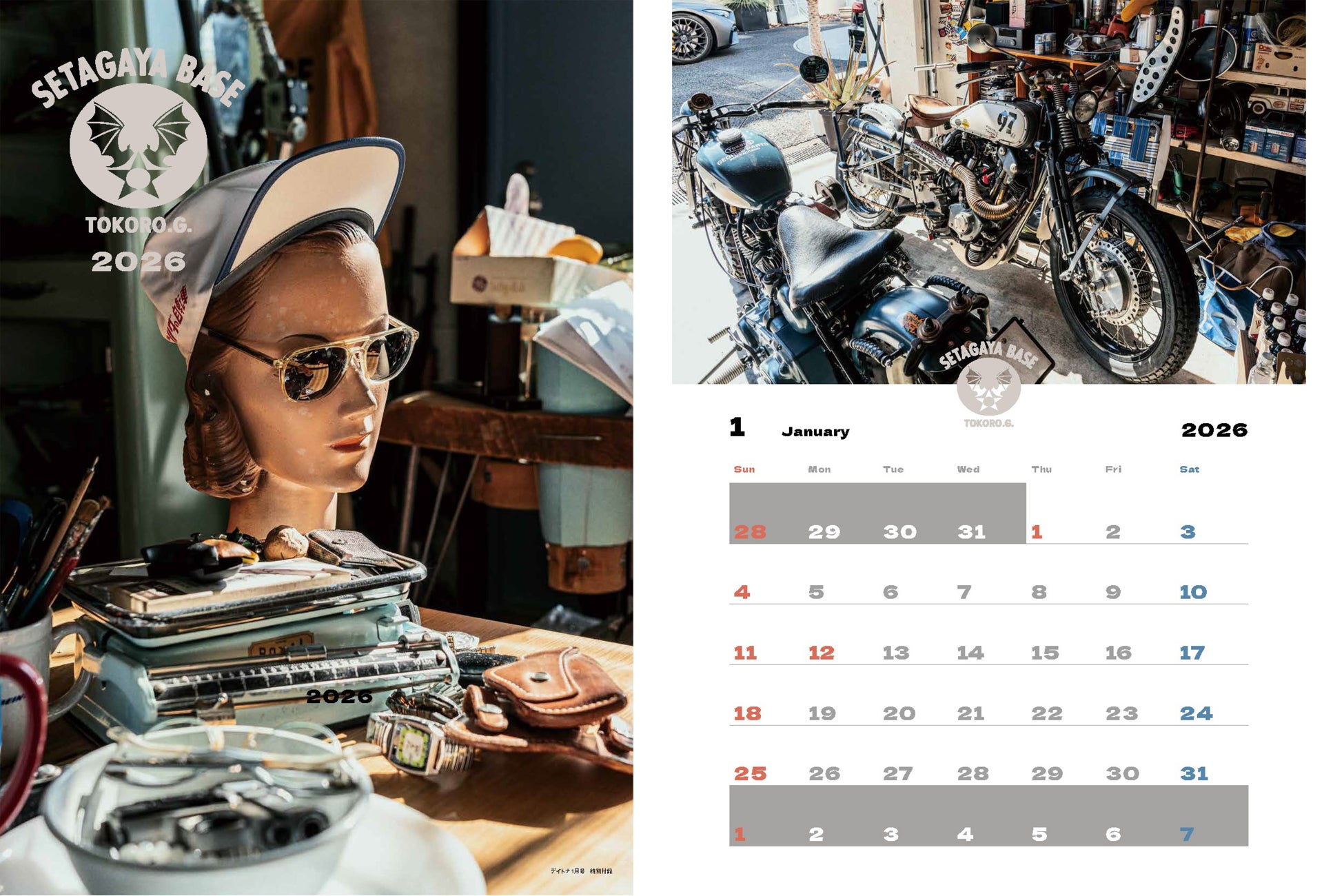 所さんの秘密基地「世田谷ベース」に収まるクルマ、バイク、雑貨などをグラフィカルに収めた2026年度版カレンダー。
