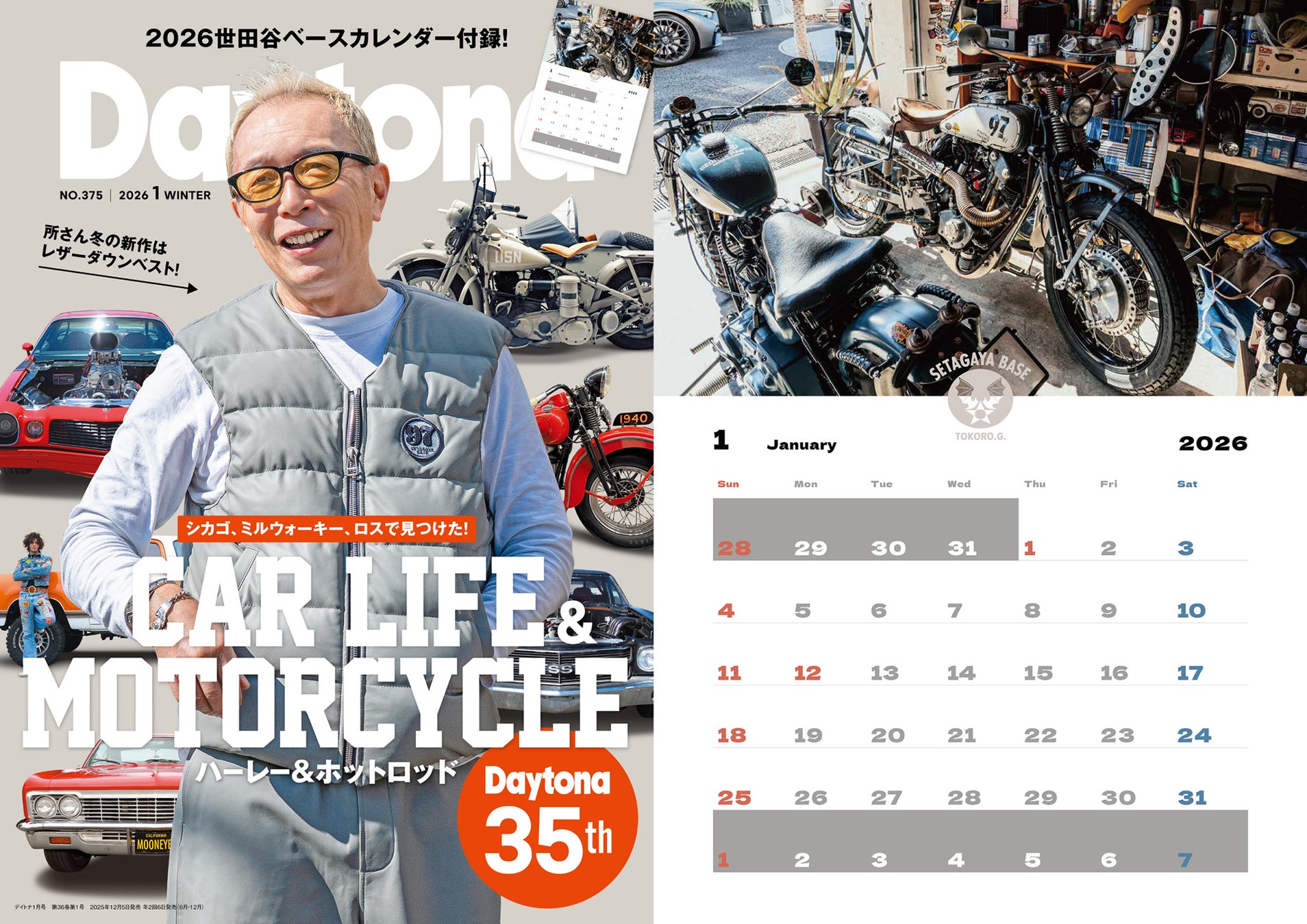 「所さんの世田谷ベース」2026年カレンダー付き 「Daytona 375号」 12月5日(金)発売。 特集は「ハーレー&ホットロッド」 Daytona WEBでは創刊号を無料公開中